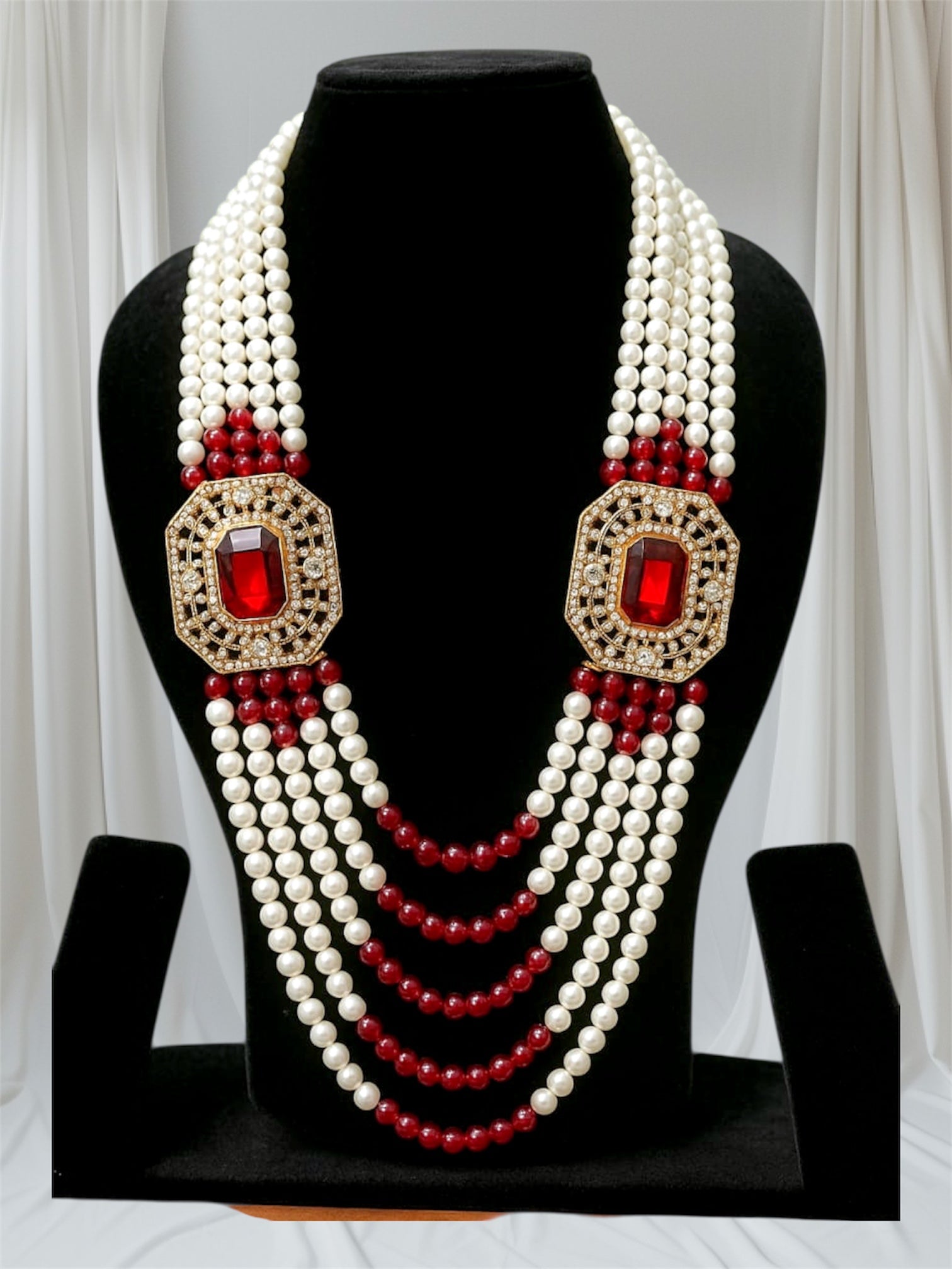 Elevate your ethnic ensemble with our "Rajshree Haar", a majestic handcrafted necklace that embodies timeless tradition and royal elegance. Featuring five strands of alternating ivory pearls and deep ruby red beads, this haar is a perfect blend of Mughal-inspired opulence and modern charm.