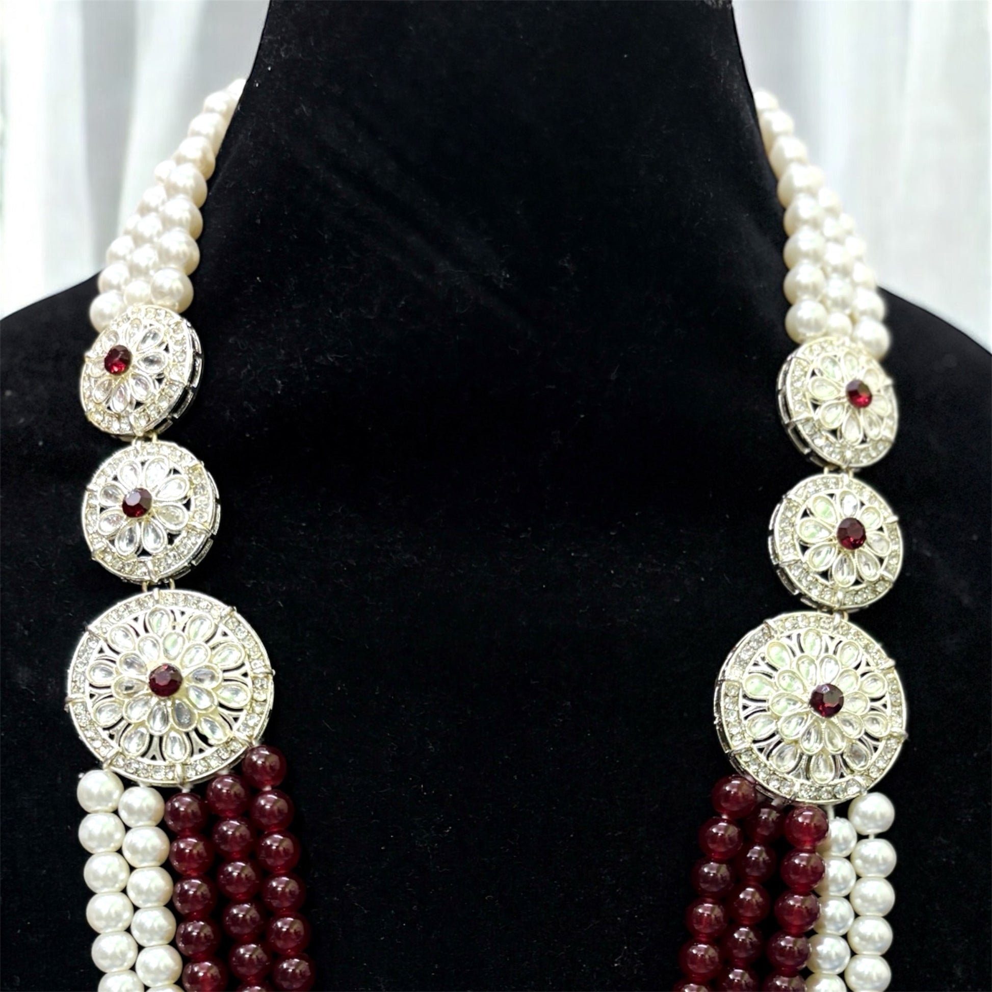 Step into royal elegance with the Rajwada Adya Haar — a luxurious multi-layered necklace crafted with lustrous white pearls and deep maroon beads. Adorned with intricately designed antique-style metallic discs, this necklace is perfect for weddings, traditional celebrations, and grand occasions.